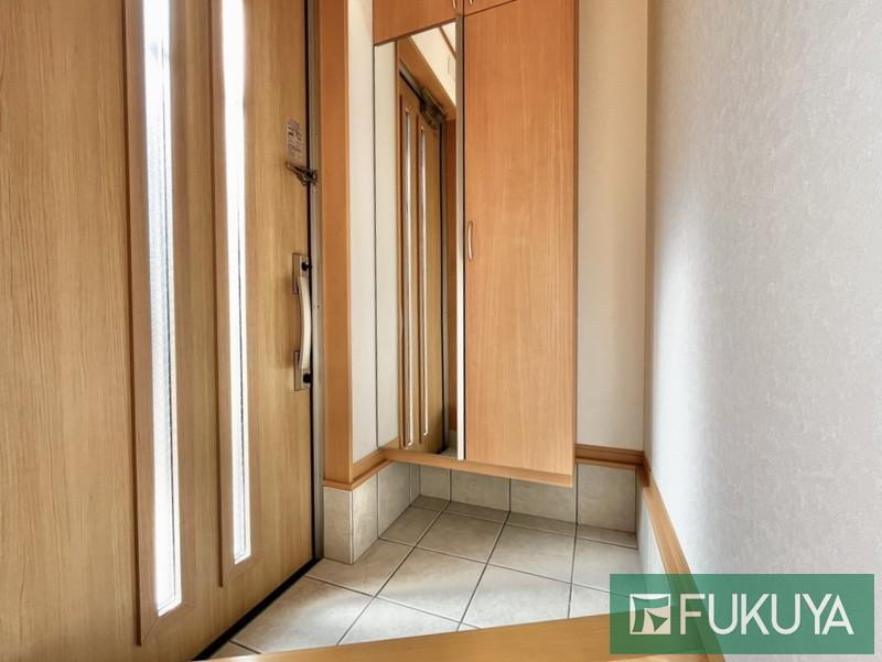 光を採り入れるデザインの玄関扉。全身鏡付の下駄箱がございます。