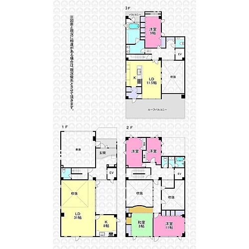 間取り:5LDK (1階:LD31帖 K8帖 、2階:洋室8帖 洋室6帖 和室8帖 洋室11帖 、3階:洋室9帖 LD11.5帖 K5.5帖 パントリー2.4帖)/周辺環境も合わせてご案内いたします。/「インターネットを見て」とお問い合わせいただくとスムーズにご案内できます。まずはお電話をお願い致します。