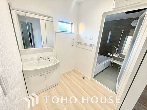 身だしなみのチェックがしやすい大きな鏡、下には収納がたっぷり。スッキリとした空間を演出いたします。