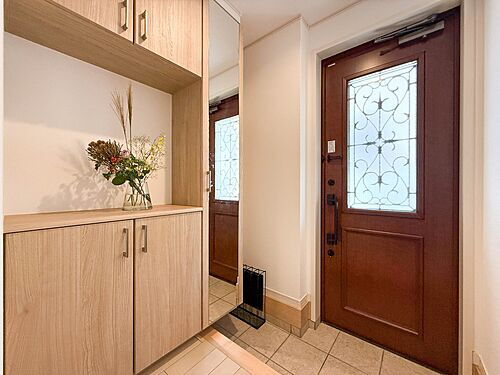 【玄関】玄関はおうちの顔と言われます。玄関アプローチは、外観デザインの印象を左右します。ご家族の個性を出しながら、素敵な玄関でお客様をお迎えしてください。