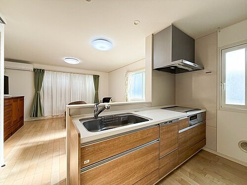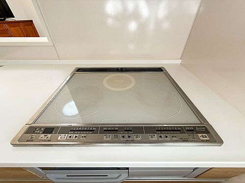 【IH三口コンロ】奥さま目線で考え、調理に重宝する三口コンロをシステムキッチンに採用、ワイドな洗い場も設けも野菜や食器を洗うのを便利にしました。