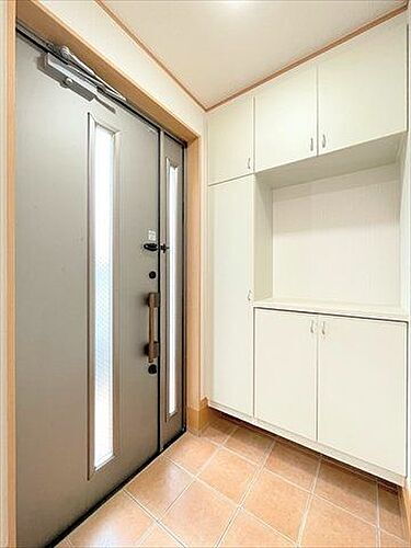 玄関には収納棚が設置されています。家族全員分の靴など片付けておけるのでスッキリとした空間を保てます◎