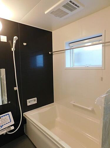 【浴室】1日の疲れをゆっくりと癒せるバスルーム。落ち着いた雰囲気のアクセントパネルを施しています。年中快適に洗濯物を乾かせる嬉しい浴室暖房乾燥機付き。