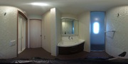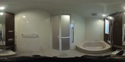 ダークブラウンのパネルがスタイリッシュな印象を与えます。窓があり自然光が差し込むバスルームです。収納スペースも充実しており整理整頓しやすい設計です。