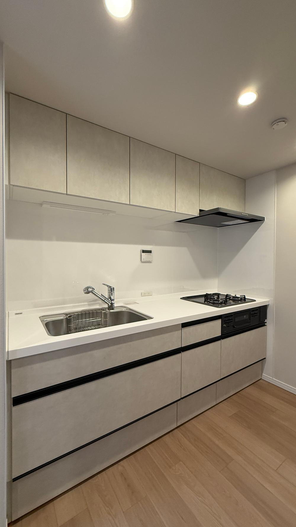 【新品交換済みのシステムキッチン】リビングを見渡せる対面式ではありませんが、お料理に集中できる壁付けタイプを採用。収納力も豊富で、背面のスペースも広く確保されているため、冷蔵庫や棚も配置しやすいです!