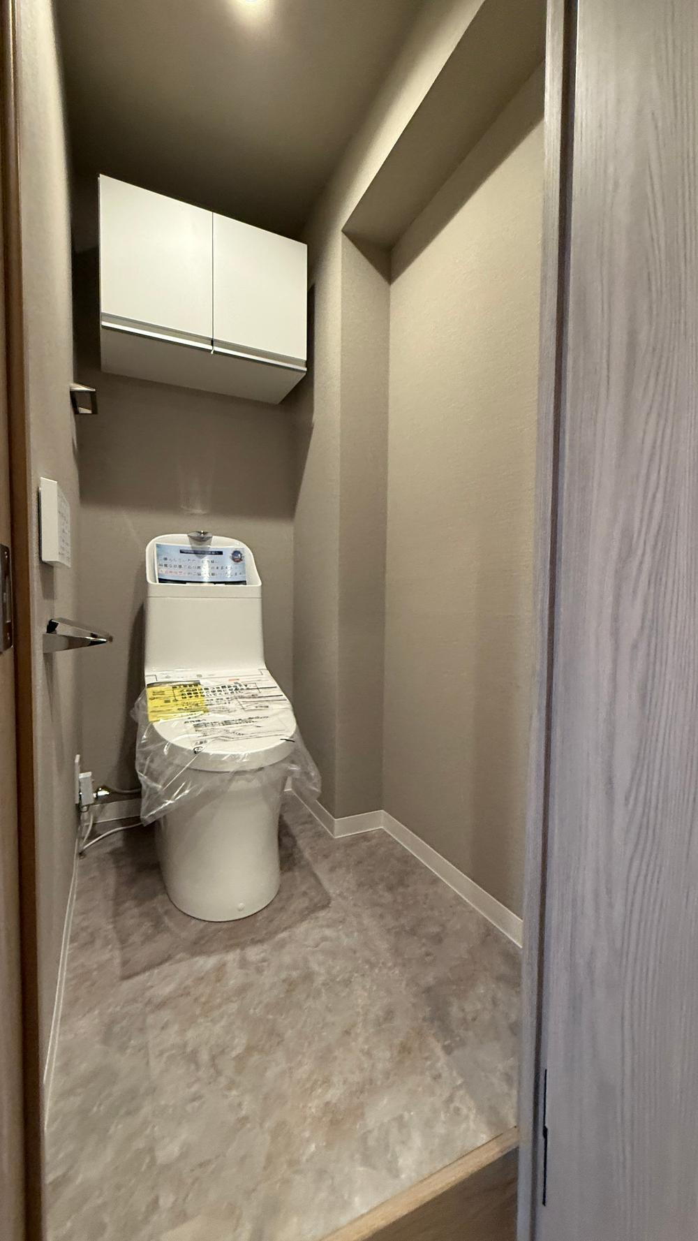 ウォシュレット一体型トイレに新規交換済!壁紙や床材も一新され、落ち着ける空間です。上部には吊戸棚があり、トイレットペーパーや掃除用品もスッキリ収納できます♪