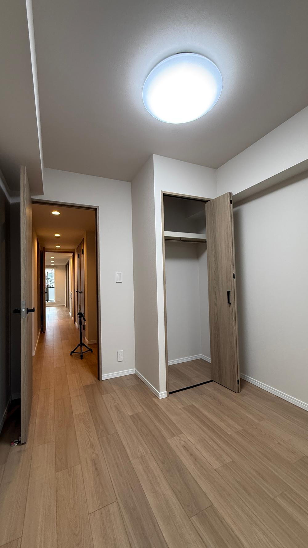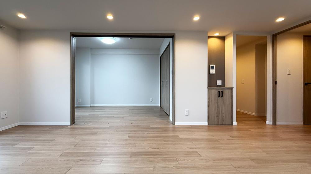 【明るく清潔な廊下】玄関からリビングへ続く動線も、クロス・床材を全交換済みでピカピカです!各居室へのアクセスもスムーズ。ダウンライトの優しい明かりが、帰宅した家族を温かく迎え入れてくれる空間です。