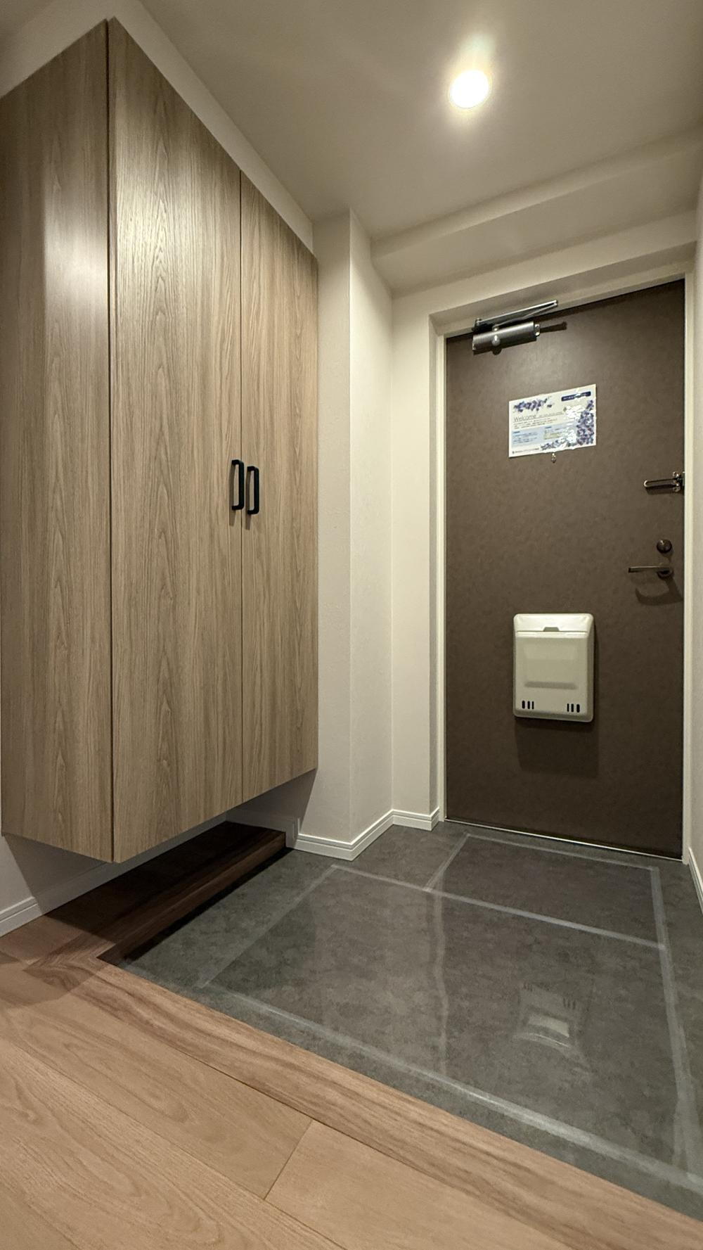 【住まいの顔・玄関ホール】トールタイプのシューズボックスを新設!ご家族全員の靴をたっぷり収納でき、玄関周りはいつもスッキリ。人感センサー照明付きなので、帰宅時に両手が塞がっていても自動で明るくなり便利