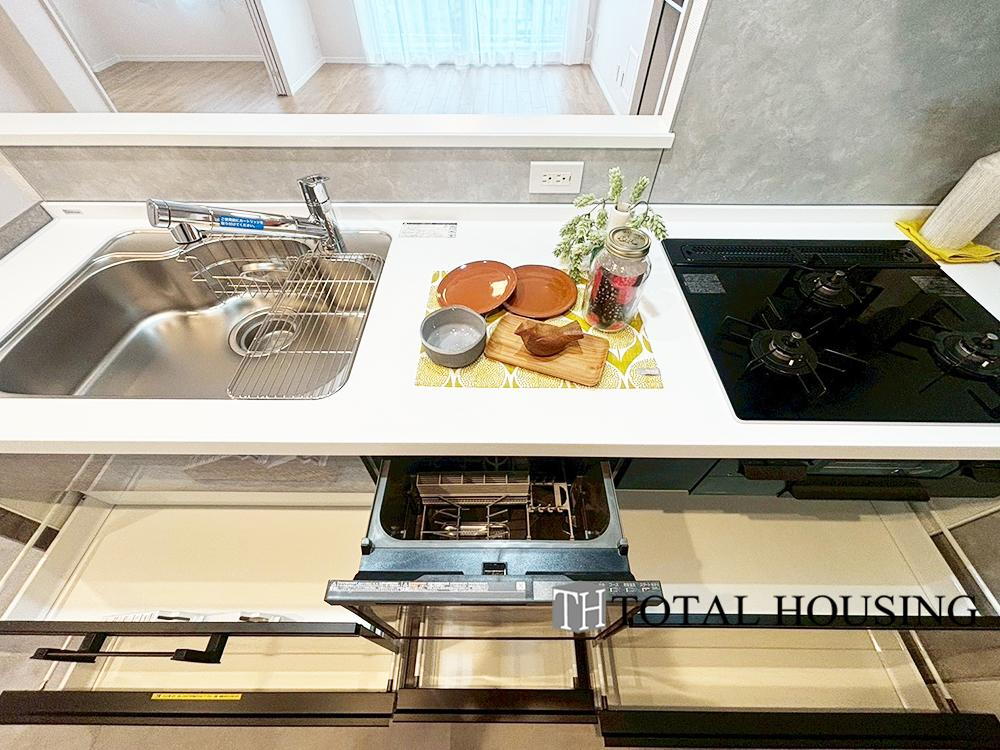 食器洗乾燥機付きで家族の食器もピカピカ。後片付けもラクラクこなせて、日々の生活には欠かせない便利設備。環境にもママの手にも優しいのがうれしいですね。