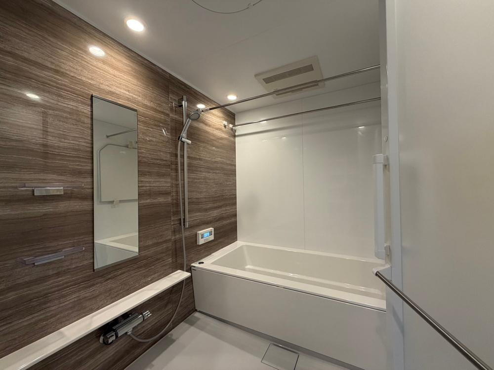 木目調パネルの高級感あるバスルーム。追焚機能付きで快適なバスタイム。