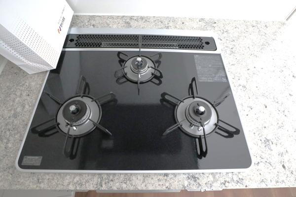 3口ガスコンロのため、火力が必要なお料理も時短となるのがうれしいポイントです♪また、都市ガスを採用していますので家計にもうれしいですね☆