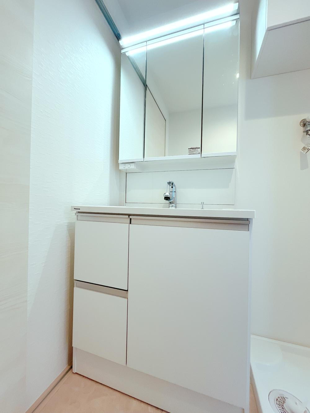 洗面台はいつも清潔にしておきたいですよね!シャワー付きのドレッサーには鏡の裏に収納スペースがありますので、化粧品やティッシュボックス、歯ブラシなどもスッキリ収まりますよ!