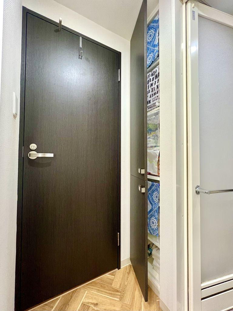 洗面室ドア横の可動棚付き物入れは、タオル類や洗剤のストック収納に便利です。