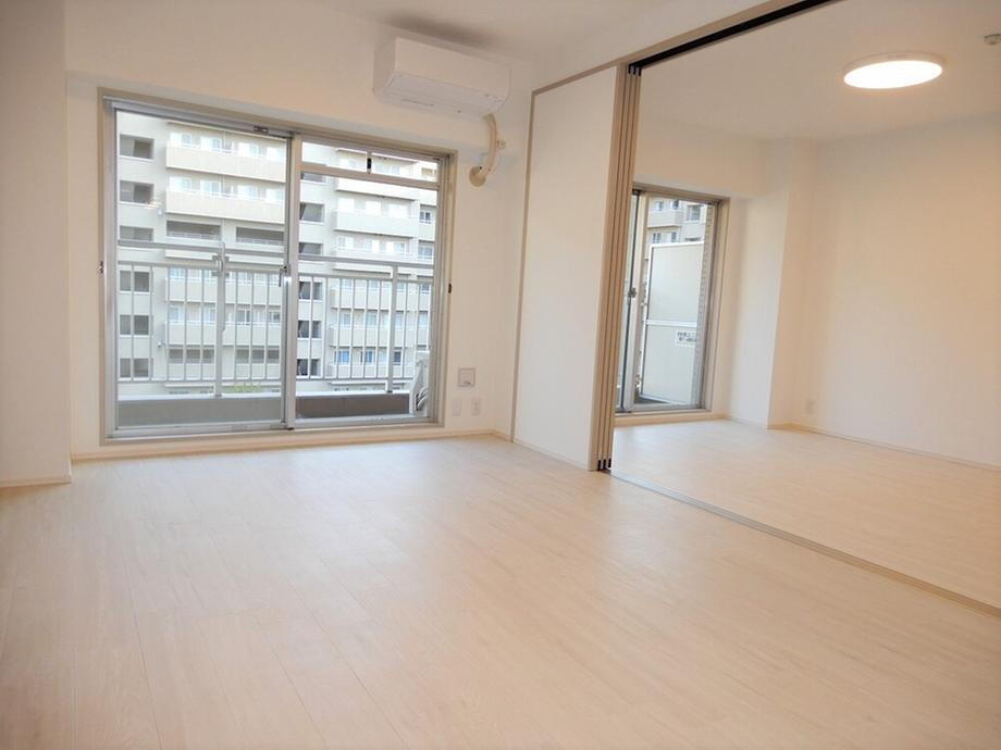 南向きの明るいリビング。隣室との扉の開閉で開放感のある空間としてもお使いいただけます。