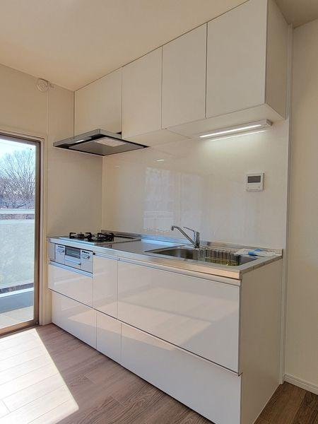 お手入れしやすいシステムキッチンです。キッチンの下に収納が設けられており、調理器具や食器などがすっきりと片付きます。