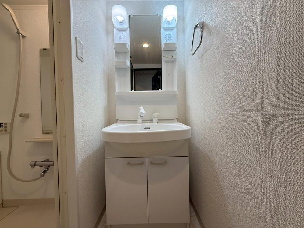 【洗面化粧台】スッキリとした見た目の洗面化粧台。三面鏡と一体となったキャビネットは収納力も抜群です。日用品の買い置きにもピッタリですね♪