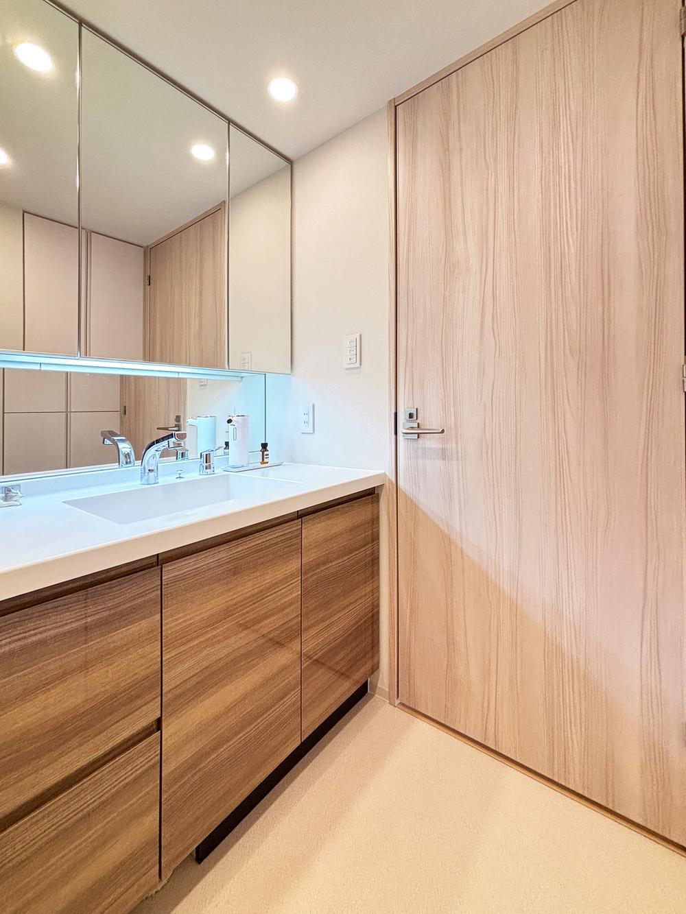 三面鏡収納付きの洗面化粧台。洗面スペースにはタオルやインナー類を収納できるリネン庫が配置されています。