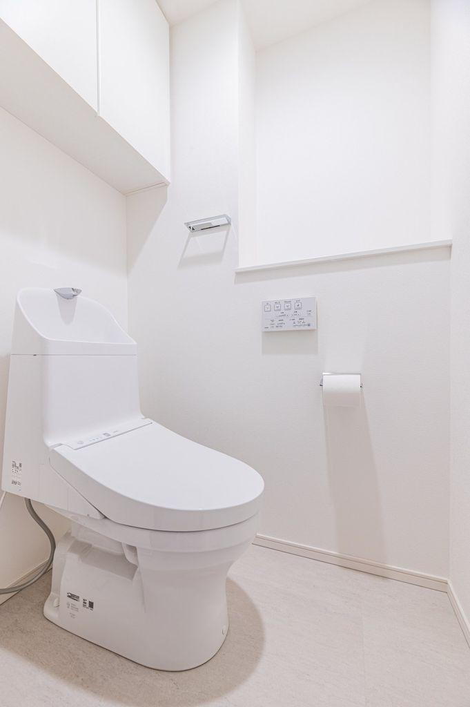 温水洗浄便座付で、毎日快適にお使いいただけるトイレです。掃除用品やトイレットペーパーの保管に役立つ収納が備わっています。※家具調度品は売買対象に含みません。 -