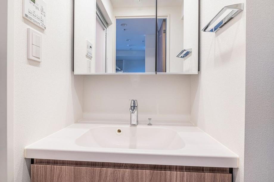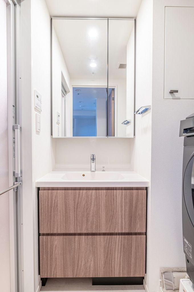 お手入れがしやすく、清潔にご使用いただけます。ボウル下に、ヘアドライヤー・洗濯用品・リネン類などを収納可能です。※家具調度品は売買対象に含みません。 -