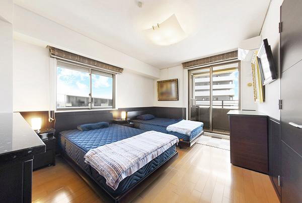 約10帖の居室は2面採光でウォークインクローゼット付き。大きなベッドを並べてもゆったりとしております