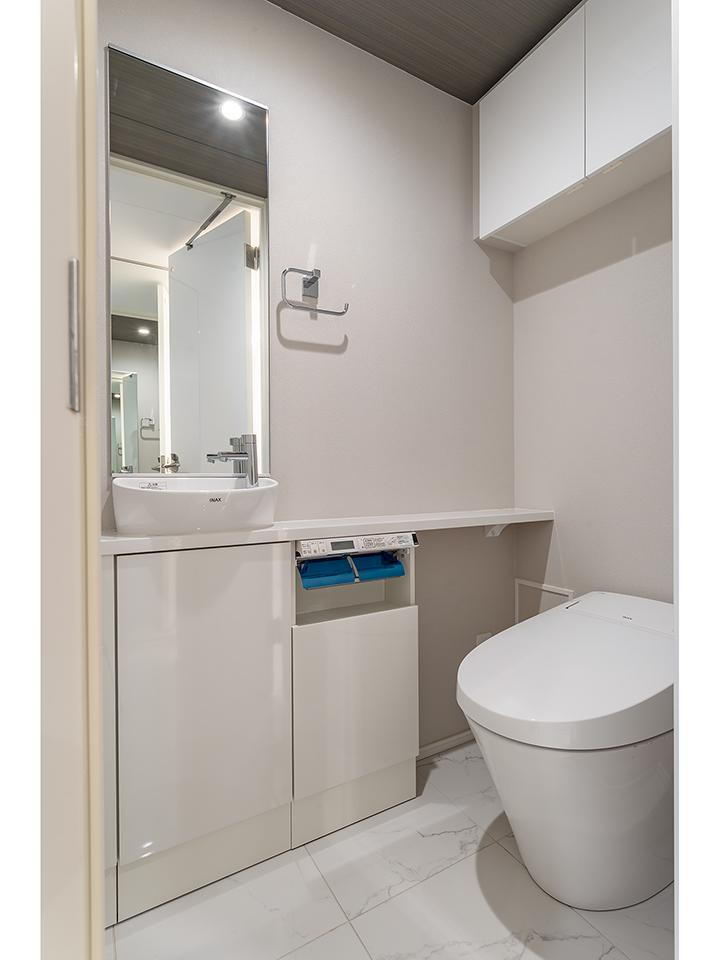 鏡、手洗い、収納付きのトイレです。 -