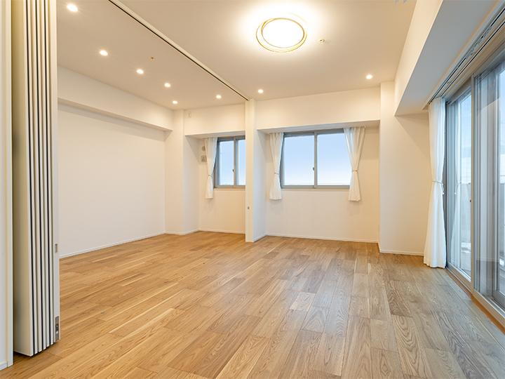 LDに隣接した洋室約4.6帖の可動式間仕切りを開放すると広々2LDKとしてお過ごしいただけます。 -