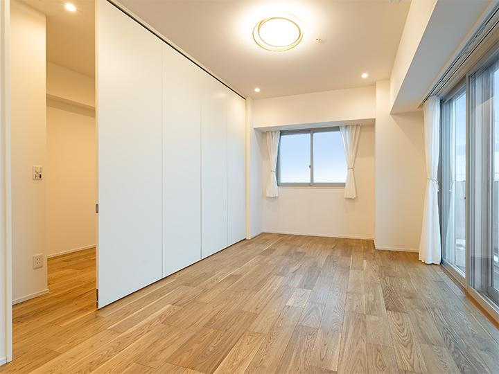 東向きバルコニーに面した洋室です。可動式間仕切りを採用しているため、洋室としても、広々2LDKとしてもお過ごしいただけます。クローゼット付きです。 -