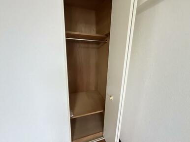 約7.5帖洋室のクローゼット写真です。少しコンパクトですが、棚の取り外しが可能で使い勝手は良さそう
