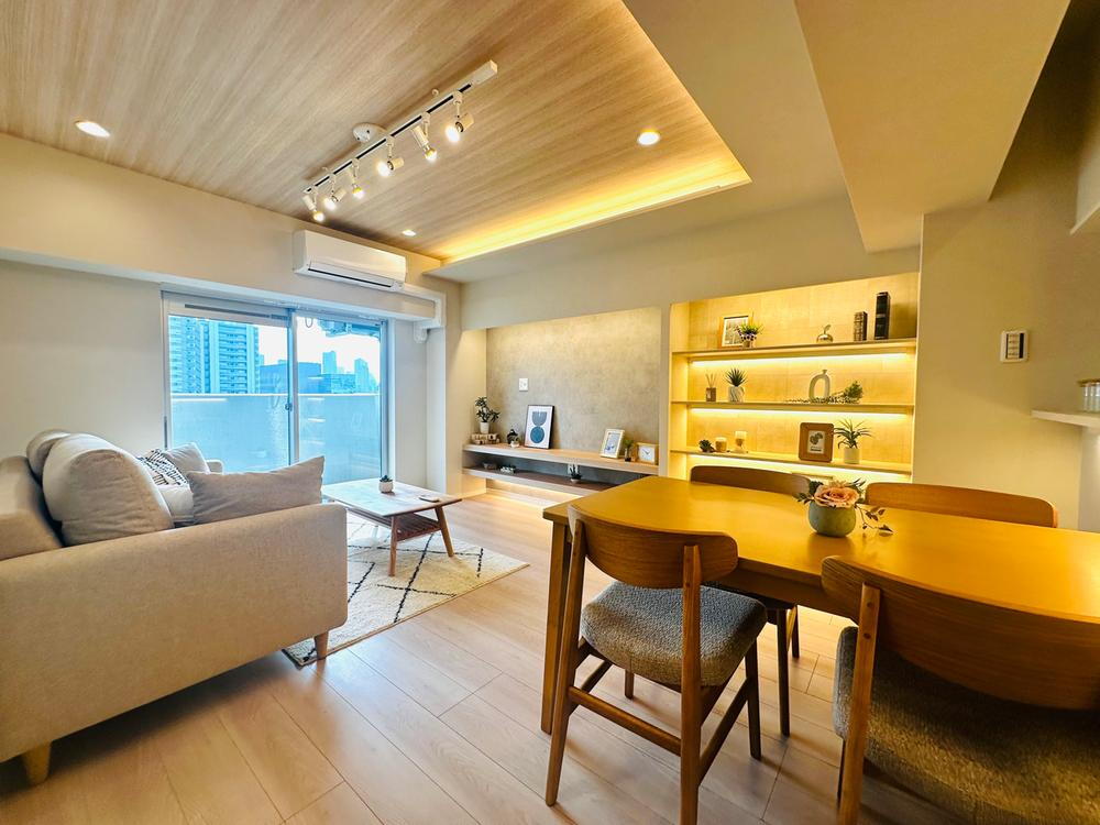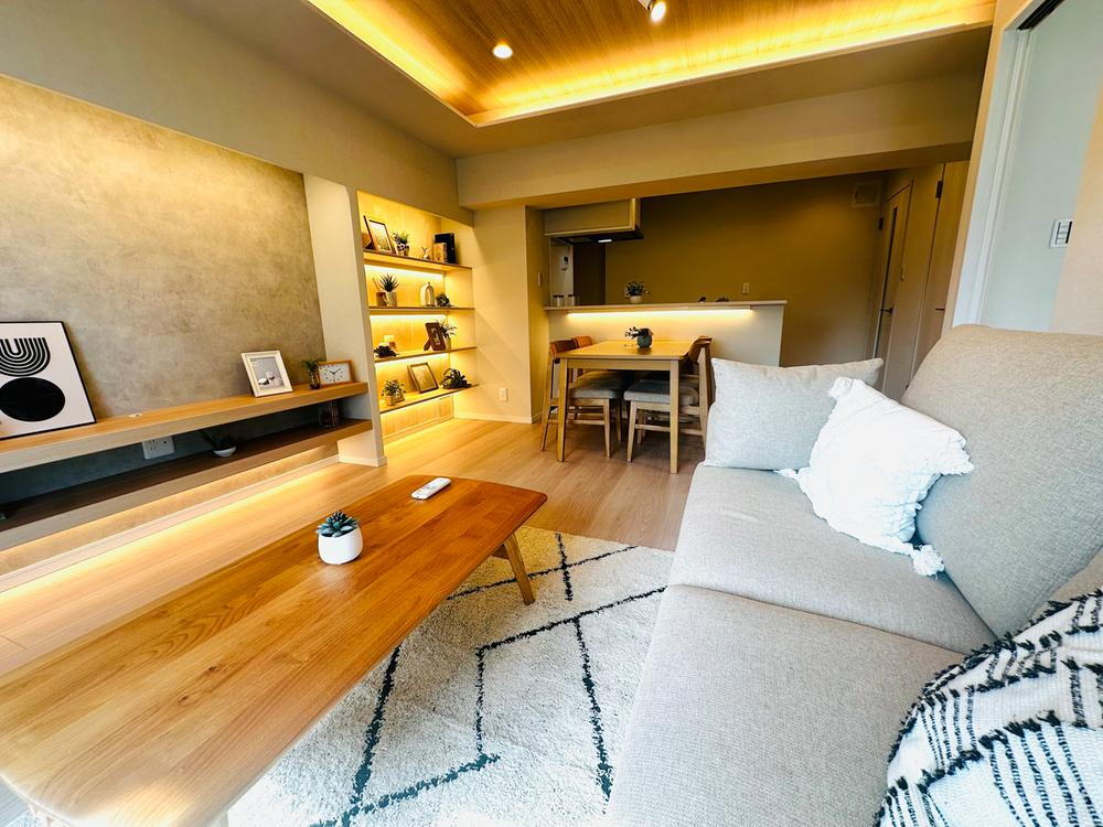 アクセントクロスや折り上げ天井、間接照明が目を惹くリビングはおしゃれで落ち着いた空間。細部までこだわった空間は、ひと目でその魅力が伝わる特別な住まいです。