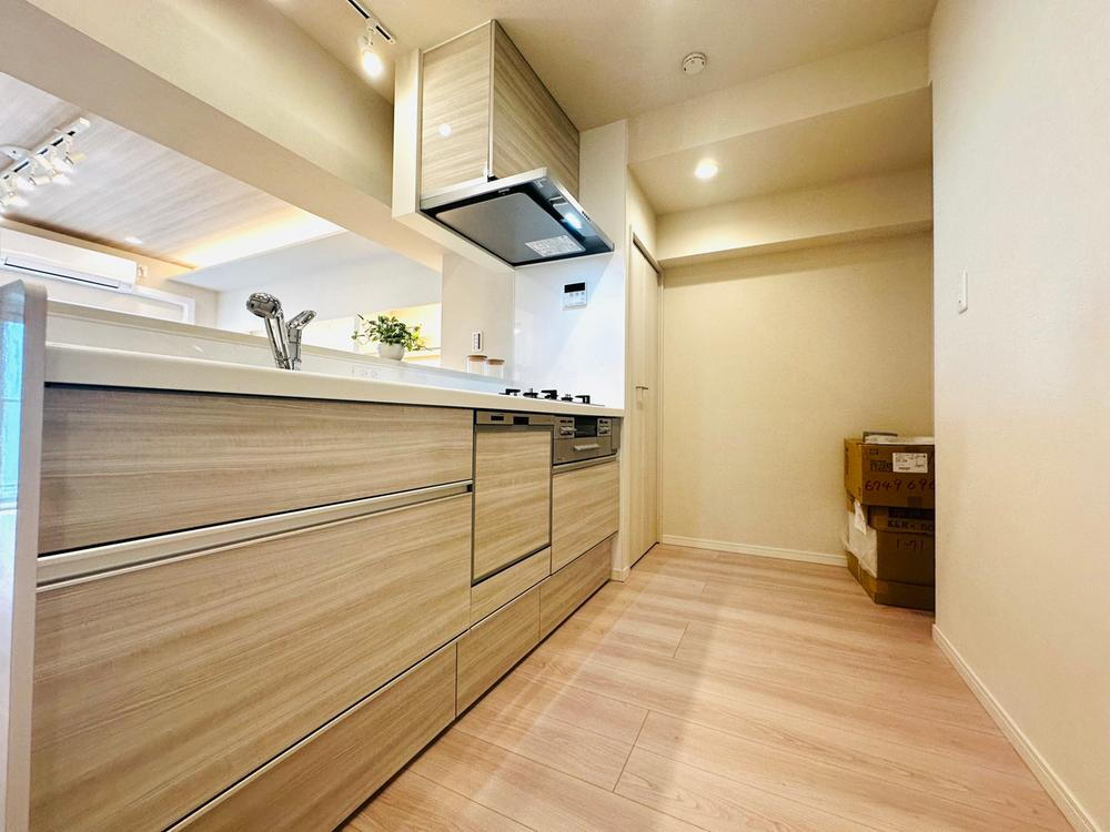 キッチンスペースは広く、背面に冷蔵庫やカップボードを配置しても広々ゆとりがあります。収納豊富なので調理器具が多い方でも安心!家事の負担を軽減する食洗機を標準装備。収納はスライド式