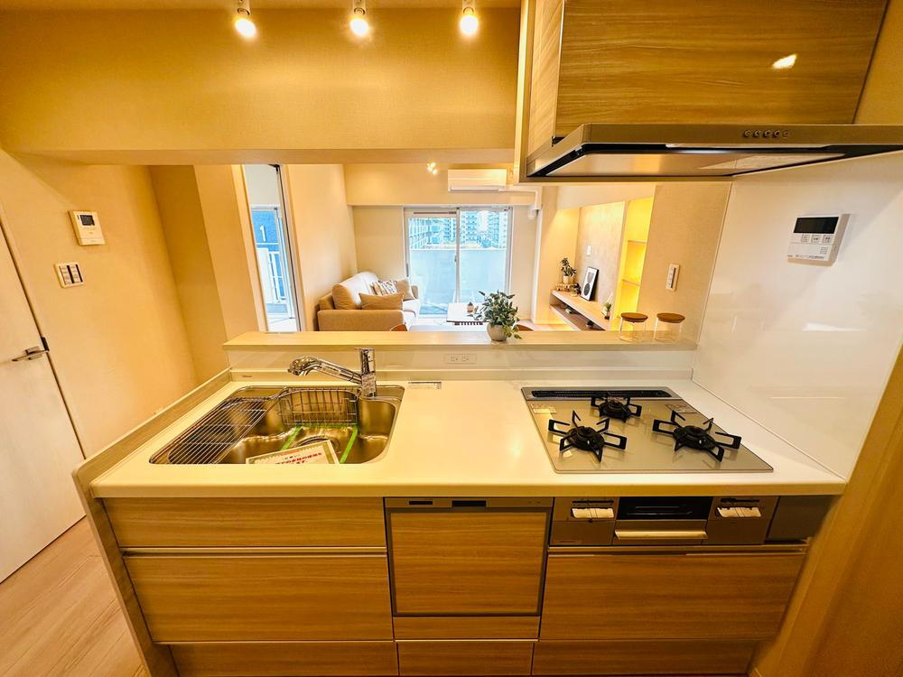 キレイを保ちお手入れが楽な人工大理石ワークトップのシステムキッチンです。会話を楽しめる対面式ながら、手元やシンクを隠せる腰壁を採用。水や油跳ねも防ぎます。食洗機・三口コンロで効率もぐんと向上。