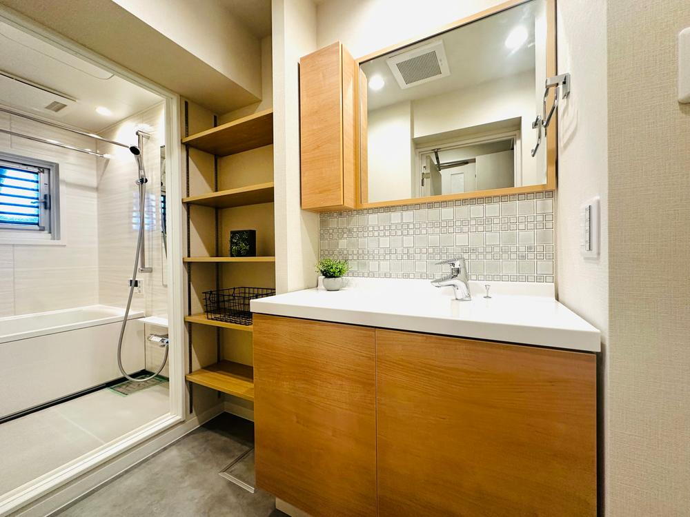 デザイン洗面でナチュラルな木目の扉カラーは落ち着きや清潔感を与えます。ミラーとボウルの間にはタイルを施して鮮やかに♪毎日の支度も楽しくなります!