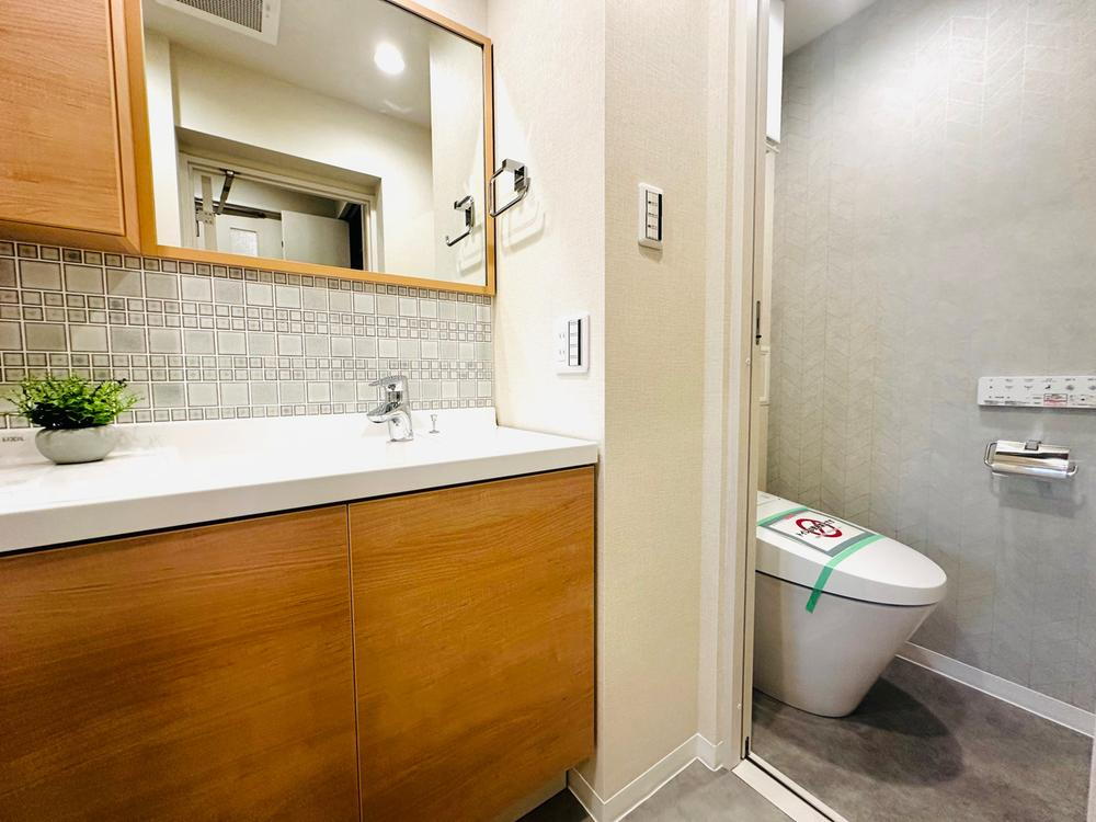 鏡横収納や下部収納、さらに壁とのスペースを有効利用したチェストを配置した収納豊富な洗面台です。日用品やバスタオルなど、扉付きのため隠して収納が可能。見た目もすっきりまとまる清潔感のある洗面所です。