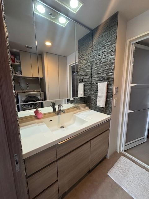 ワイドタイプの洗面化粧台なので、身だしなみを整えやすいです。三面鏡付き洗面化粧台です。