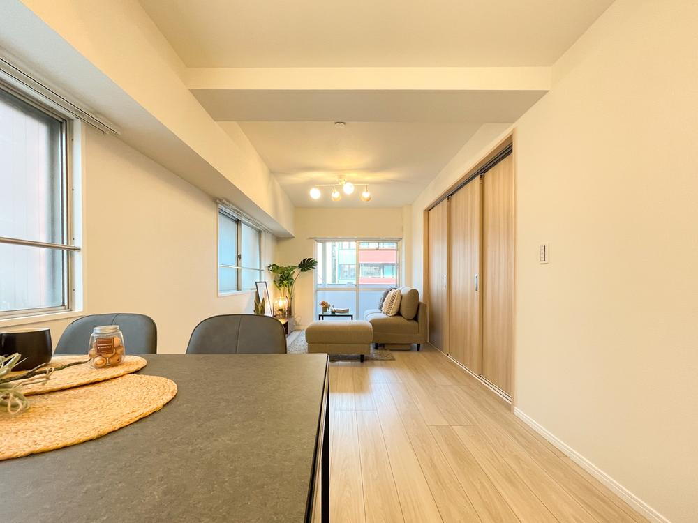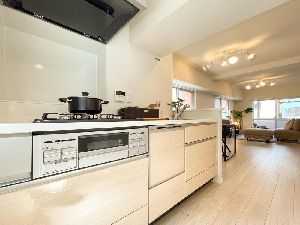 リノベーションで一新されたカウンターキッチン。食洗機付きで家事効率も高く、LDK全体を見渡せるレイアウトは団らんの中心として活躍します。