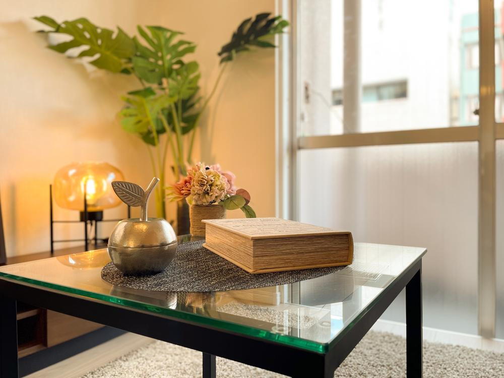 柔らかな照明と窓からの自然光が調和し、心地よいひとときを演出。暮らしの中でリラックスできる、落ち着いたリビング空間をイメージできます。