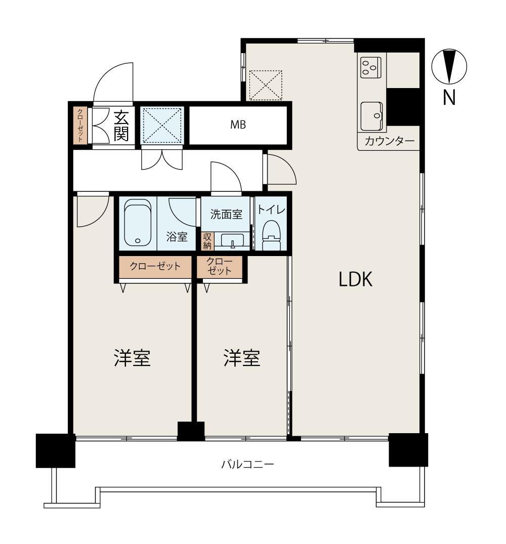 2LDK、価格6690万円、専有面積56.87m2 2LDK・53m2の住戸は、リビングと洋室が北向きバルコニーに面した開放的な設計。各居室に収納を備え、家族それぞれのプライベート空間も確保できます。