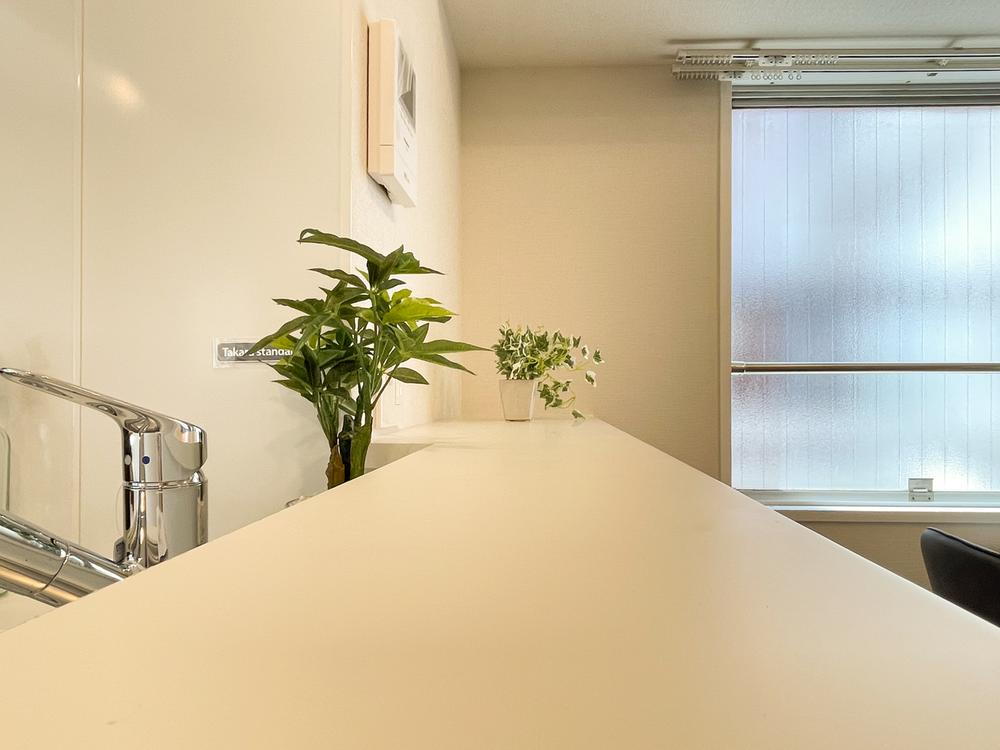 清潔感あふれるカウンターキッチン。広々とした天板は配膳や作業スペースとして便利で、窓からの光も差し込み明るい家事空間を実現します。