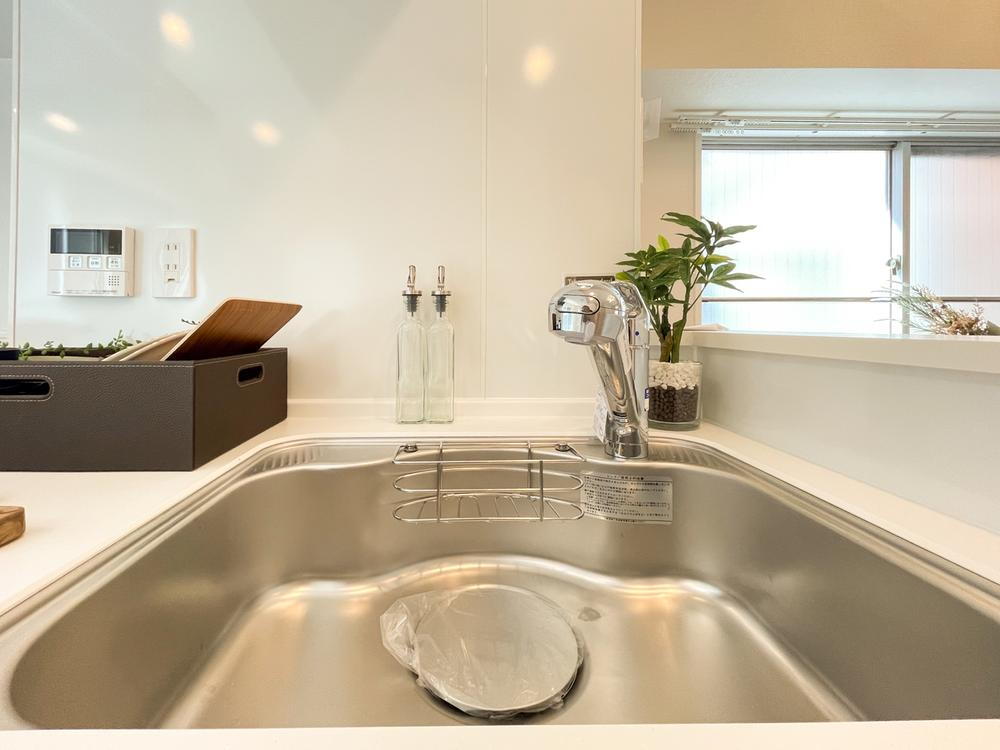 新規交換されたシンクは広々としており、大きな調理器具も洗いやすい仕様。浄水器一体型水栓を備え、毎日の家事を快適にサポートします。
