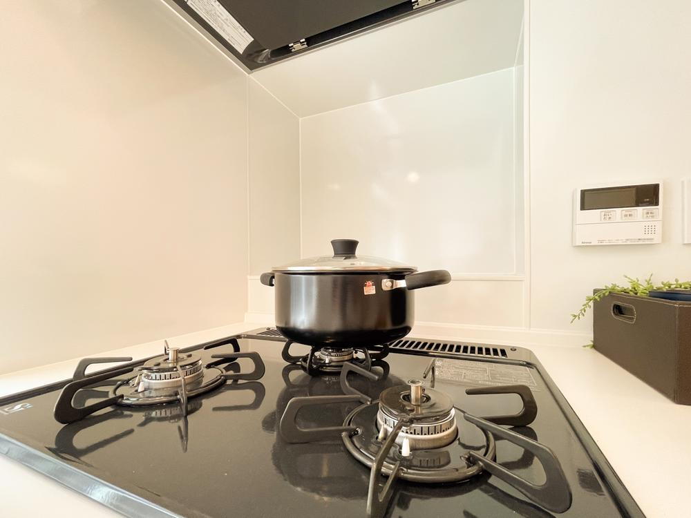 新規交換された3口ガスコンロは、同時調理もスムーズに行える便利な仕様。毎日の料理を効率よく楽しめる、機能性とデザイン性を兼ね備えています。