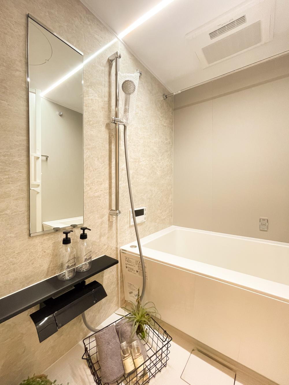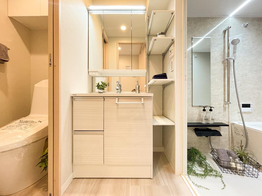 水回り設備をすべて刷新し、快適性とデザイン性を両立。三面鏡付き洗面台や収納棚、浴室暖房乾燥機など、毎日の暮らしを支える仕様です。