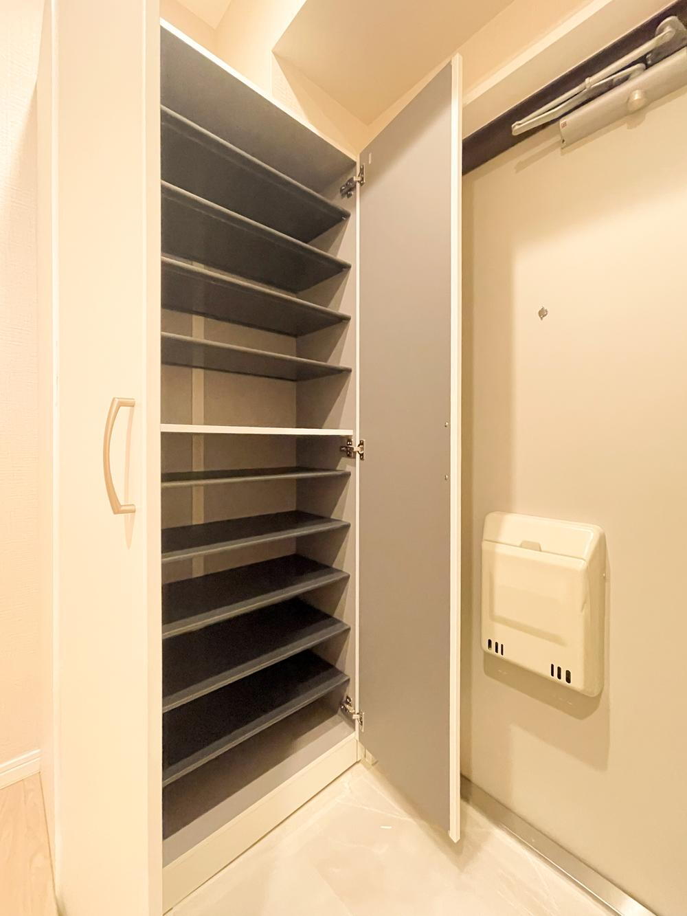 玄関には大容量のシューズボックスを設置。ご家族分の靴をすっきり収納でき、玄関まわりをいつも整然と保てる使い勝手の良い仕様です。