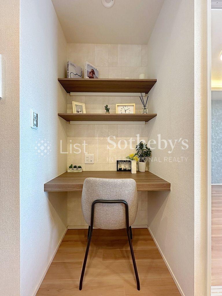リビングのデッドスペースに設けられた造作カウンター。テレワークにも対応。家の中に、感性が整う場所を。仕事にも読書にも使える、小さな美しいワークスペース。 -