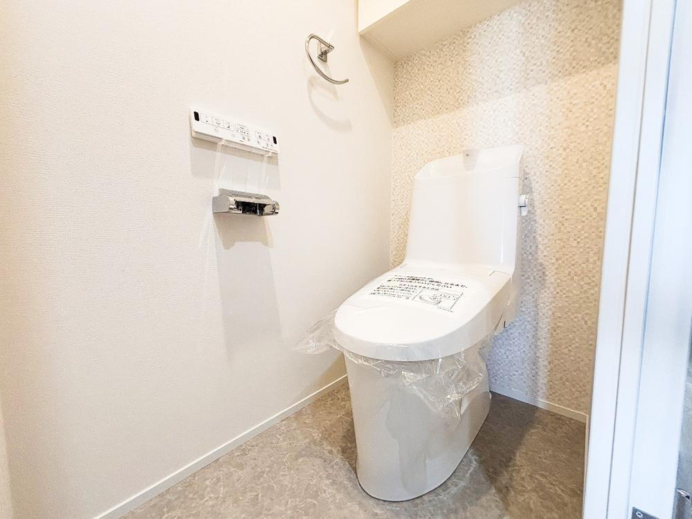 シンプルな内装で落ち着いて過ごせるトイレ。ウォシュレット機能付きで衛生的です。 -