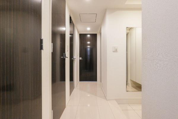 明るいタイル張りの廊下