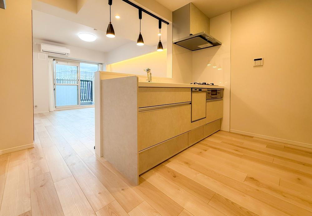リビングが見渡せるカウンターキッチン、お料理中も家族やパートナーと同じ時間を過ごせます。