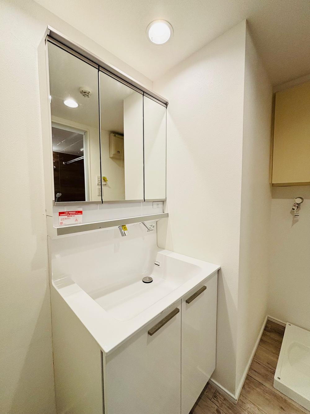朝の支度に便利な三面鏡の洗面台です。