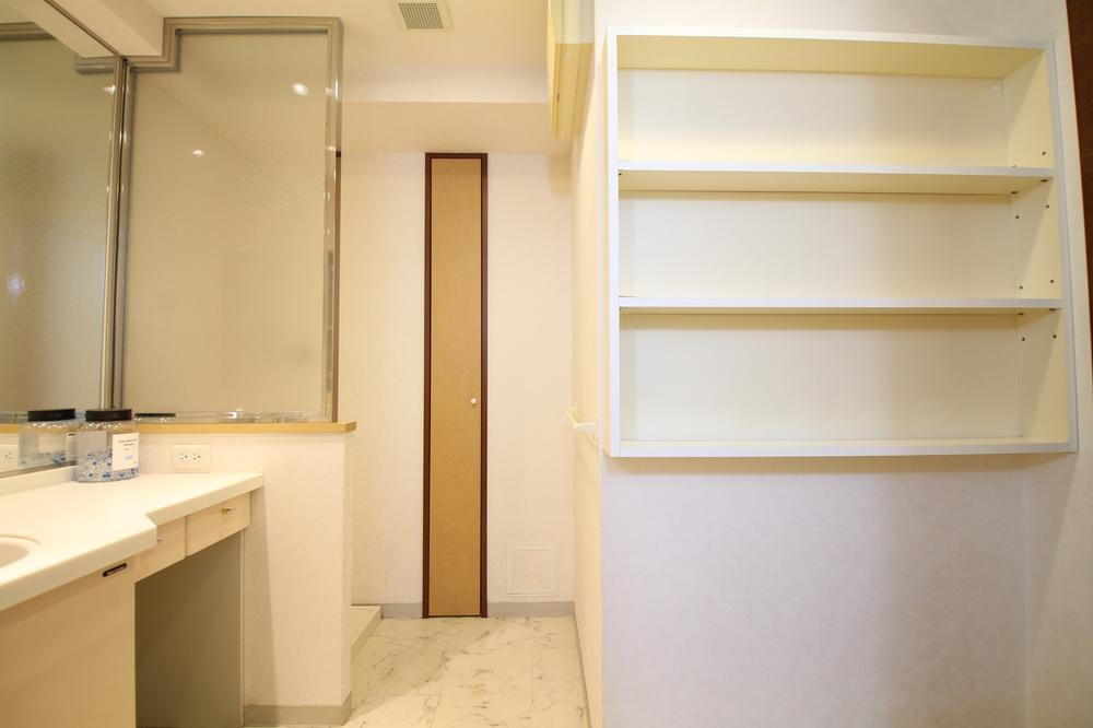 洗面台横にオープン棚を設置。タオルや洗剤などのストックを便利に収納でき、機能的な脱衣スペースです。