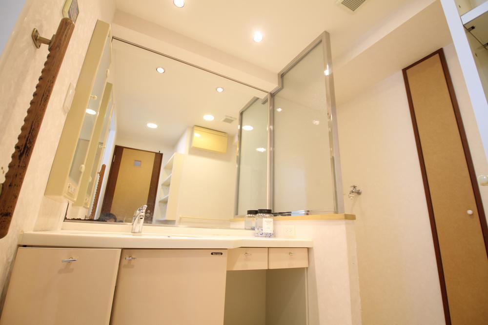 空間を広く見せる大型ミラーが魅力!広いカウンターで化粧品などを並べやすく、朝の身支度が快適です。