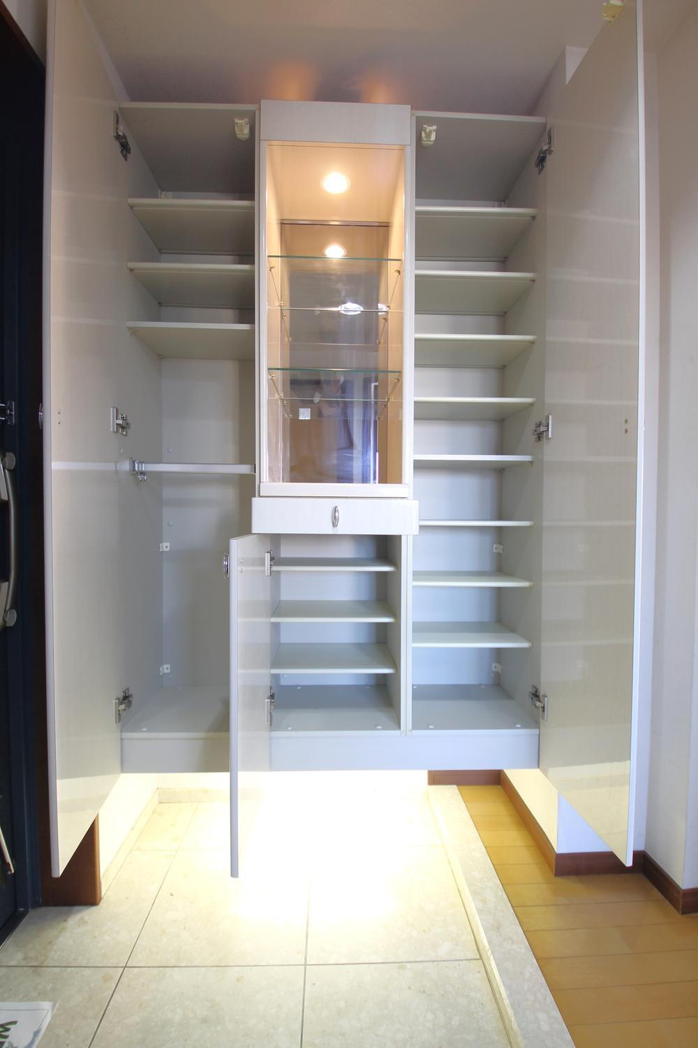 照明付き飾り棚が上品な大容量シューズボックス!靴や小物も全て収まり、玄関がいつもすっきり片付きます。